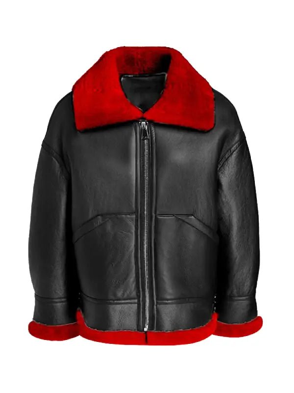 Women’s Aviator Red Shearling Black Leather Jacket